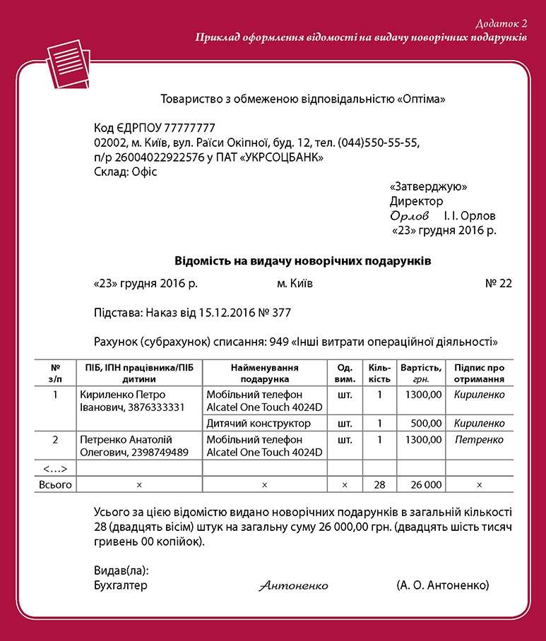 Видачу подарунків краще оформити відповідною відомістю (див. Додаток 2).