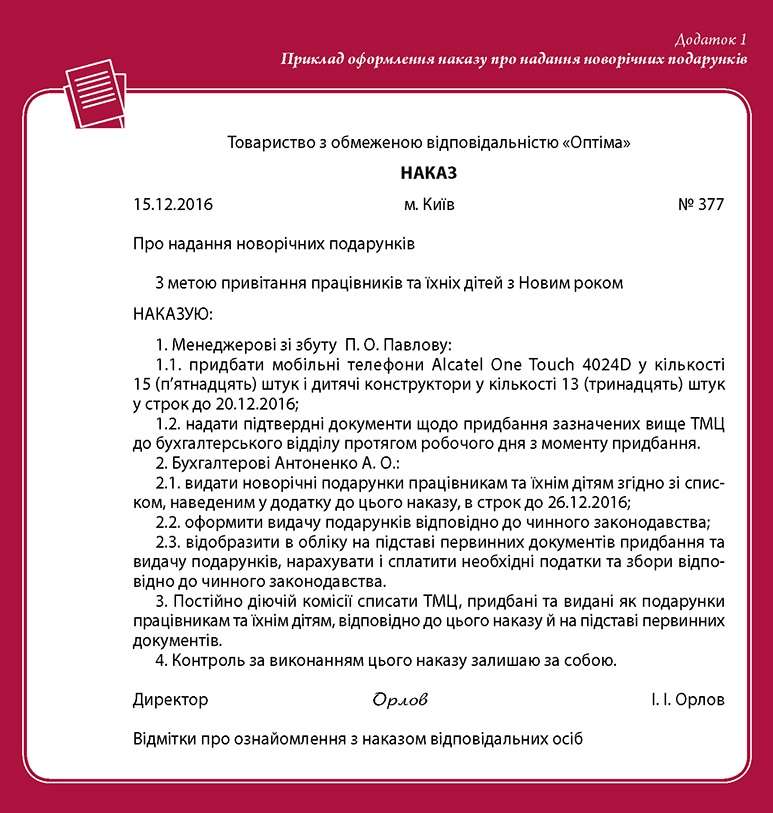 Підставою для дій бухгалтера є розпорядчі документи керівництва. Тому насамперед керівник підприємства має видати відповідний розпорядчий документ (наказ, рішення) про придбання й видачу подарунків (див. Додаток 1). При цьому потрібно скласти список дітей, батькам яких будуть передані подарунки.
