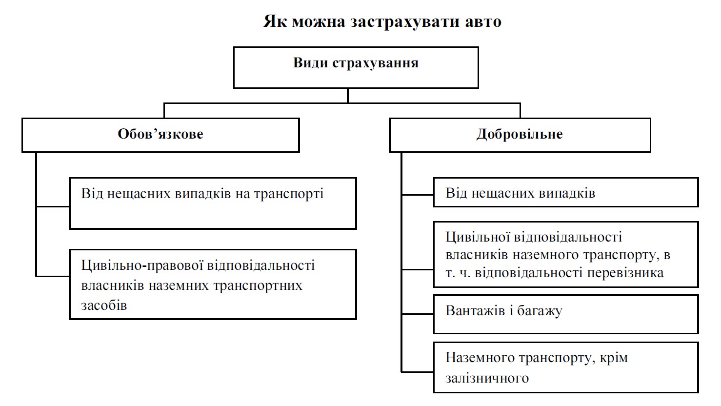 Є дві форми страхування: обов’язкова і добровільна (ст. 5 Закону про страхування). Вони, своєю чергою, включають види страхування (ст. 6, 7 Закону про страхування). Окремі види добровільного страхування відрізняються від обов’язкового тим, що покривають більше ризиків (див. Схему 1).