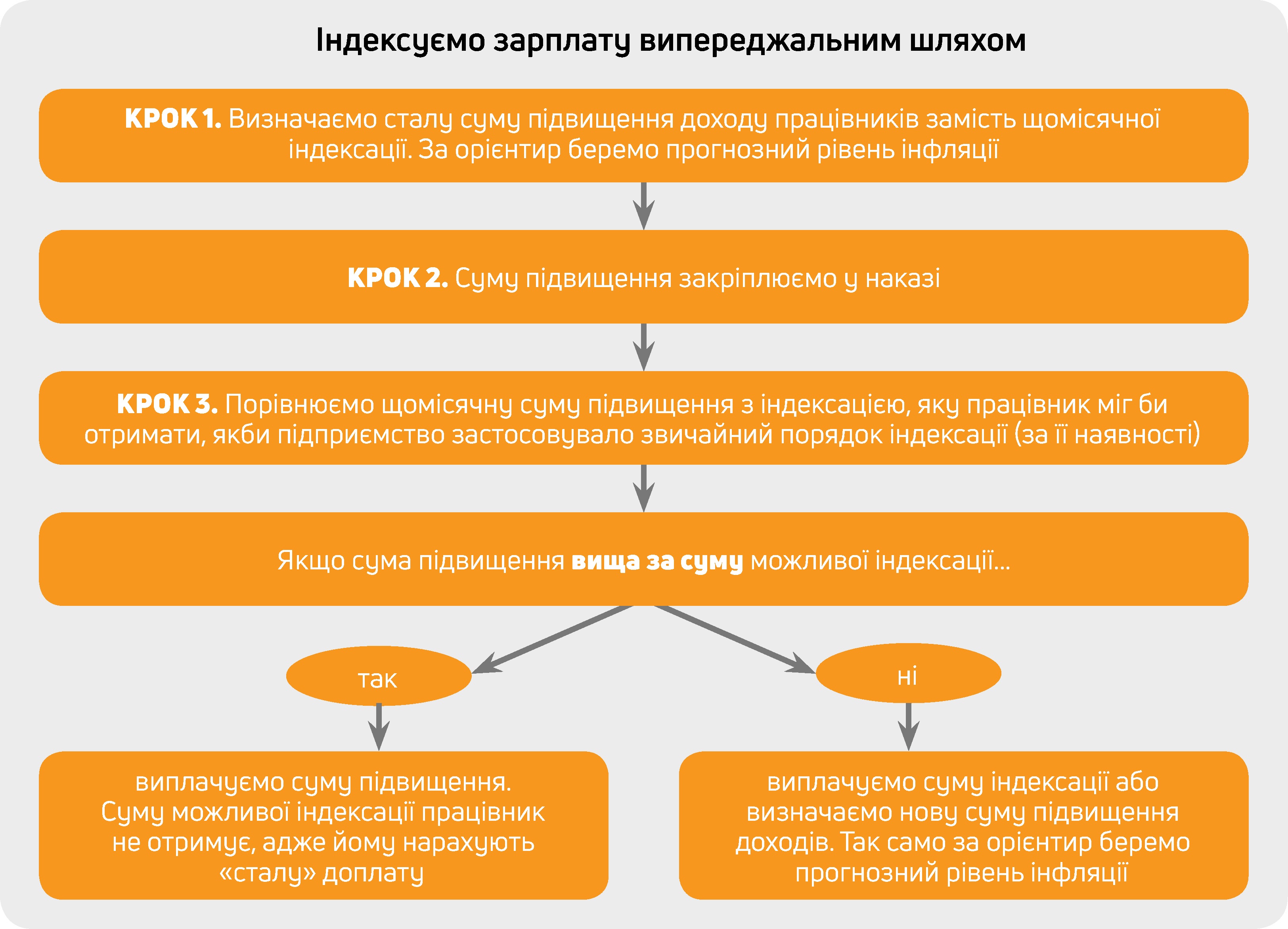 Якщо ви обрали цей варіант, насамперед переконайтеся, що немає накопиченої індексації. Якщо вона є — «обнуліть» її: підніміть оклад так, щоб загальна сума підвищення зарплати була більшою за наявну індексацію. А вже з наступного місяця підвищуватимете оклади щомісяця, якщо не боїтеся ризикувати.