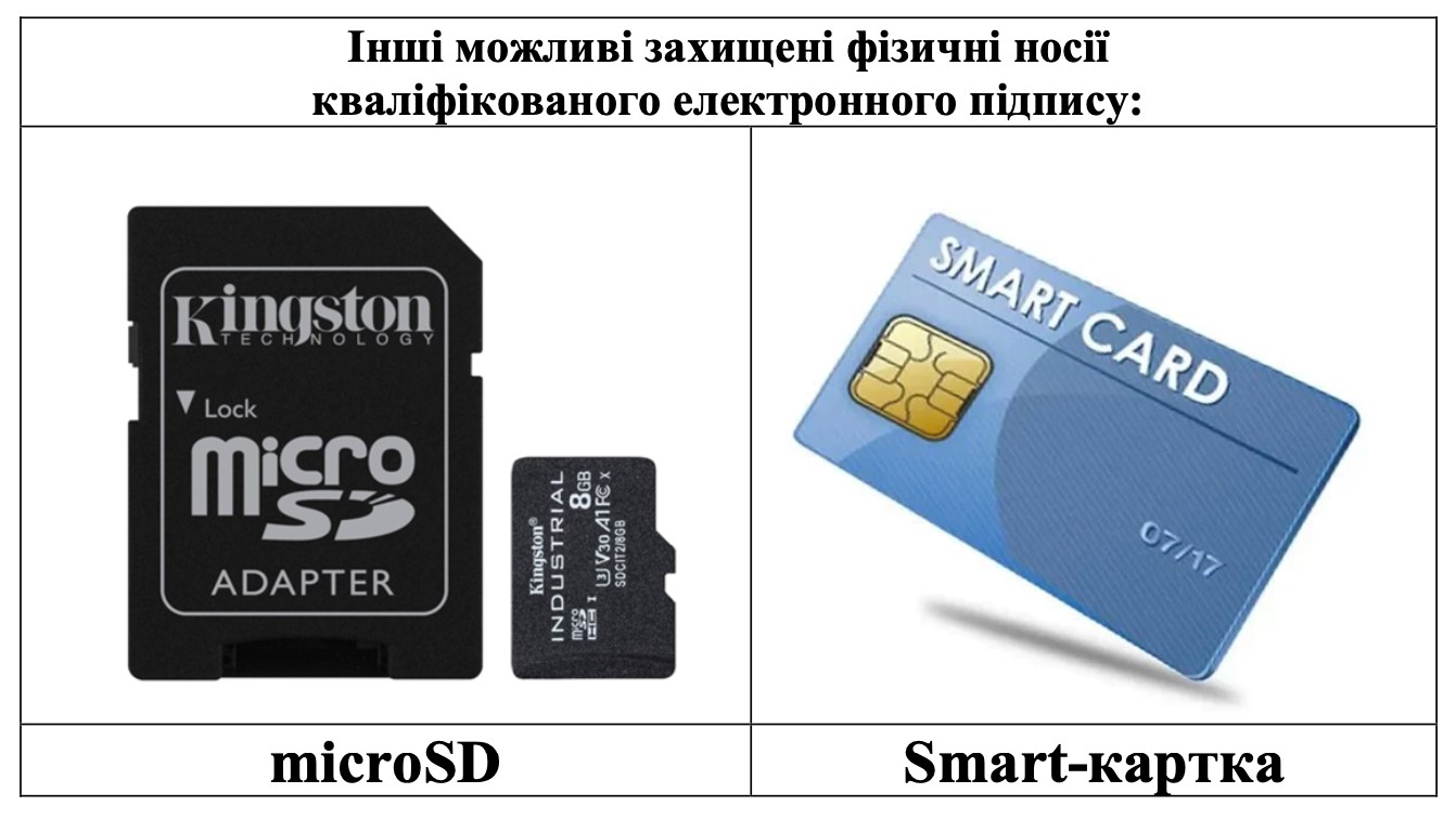 Однак як носії можуть бути використані й картки microSD, smart-картки тощо (див. нижче). Для останньої треба окремий спеціальний пристрій зчитування, якого звичайні комп’ютери чи ноутбуки не мають. Також замість фізичних носіїв можуть використовуватися «хмарні» технології, тобто ключі містяться на віддалених захищених серверах, доступ до яких здійснюється через мережу Інтернет.