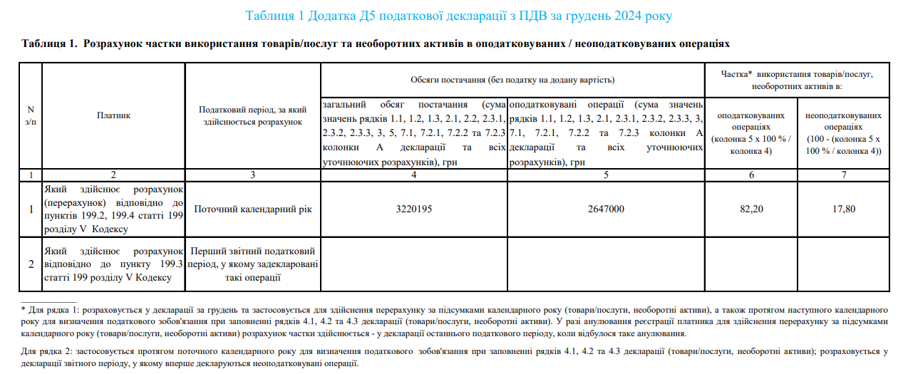 Наводимо складений зразок Таблиці 1 Додатка Д5 податкової декларації з ПДВ за грудень 2024: