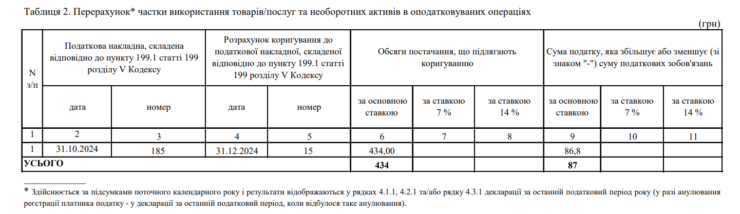 - у жовтні 2024 року були зареєстровані дві «вхідні» податкові накладні (ПН) за послугами подвійного призначення: на обсяги постачання без ПДВ 15000 грн (18.10.2024 № 154) та 5000 грн (25.10.2024 № 160);