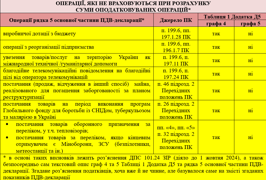 При підрахунку загального обсягу постачання за оподатковуваною діяльністю у графі 5 Таблиці 1 Додатка Д5 не враховуються дані рядка 5 колонки А декларації, до яких належать операції, які узагальнено у Таблиці.