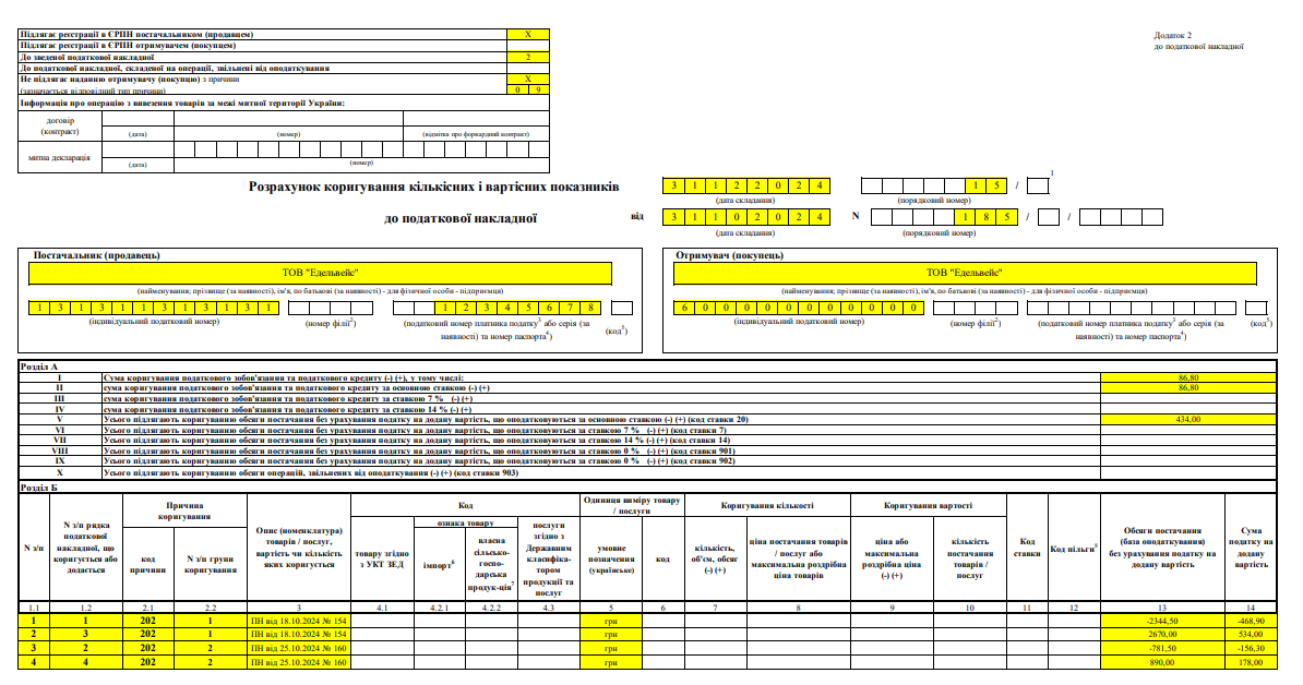 Далі складаємо розрахунок коригування до зведеної податкової накладної № 185 від 31.10.2024. Під час складання цього РК вказуємо такі дані: