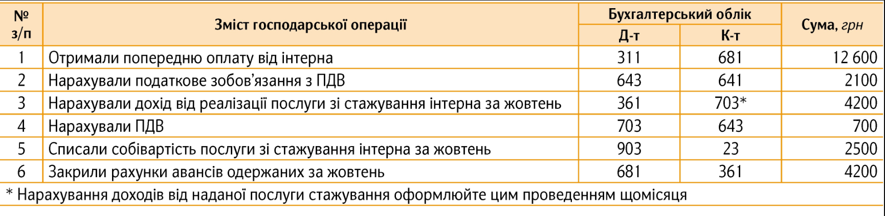 Медзаклад-КНП, платник ПДВ, надає послуги зі стажування інтернів-контрактників. Вартість одного місяця стажування — 4200 грн, у т. ч. ПДВ 700 грн. Витрати на стажування одного інтерна на місяць — 2500 грн. Від інтерна у жовтні отримали попередню оплату за три місяці стажування — 12 600 грн, у т. ч. ПДВ — 2100 грн.
