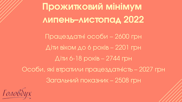 - прожиточный минимум для детей в возрасте от 6 до 18 лет 2022 — 2618 грн;
