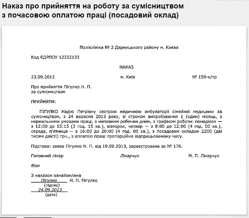Наказ про прийняття на роботу за сумісництвом СКАЧАТИ ЗРАЗОК
