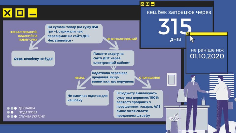 - якщо чек не був фіскалізований, ДПС проводить перевірку. Якщо виявлено порушення, продавець сплачує штраф, з суми якого покупцю виплачують «кешбек» — 100% вартості товару.
