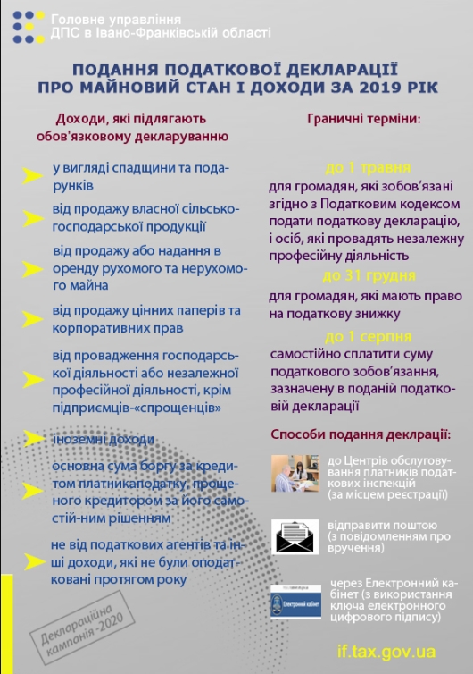 Податківців розробили пам’ятку із граничними термінами подання податкової декларації про майновий стан і доходи за 2019 рік. Скачайте і подайте вчасно!