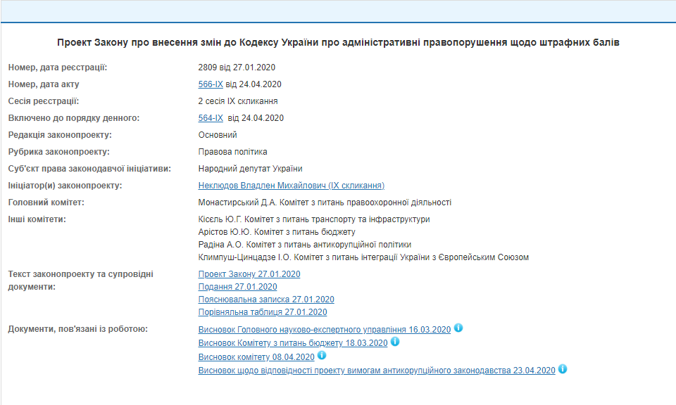 Президент підписав Закон «Про внесення змін до Кодексу України про адміністративні правопорушення щодо штрафних балів» від 24.04.2020 № 566-IX.