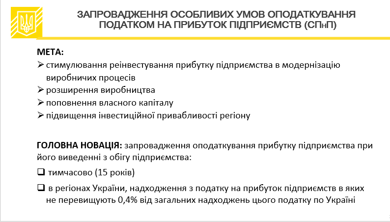 Мінфін оприлюднив проєкт Закону України, яким пропонують на території Закарпатської, Кіровоградської, Тернопільської, Чернівецької та Чернігівської областей, де незначні надходження податку на прибуток, тимчасово запровадити спеціальний податок на прибуток (далі — СПнП). Крім великих платників податків та суб’єктів господарювання, які утворені шляхом реорганізації (поділу, виділення) суб’єктів господарювання, зареєстрованих в інших областях.
