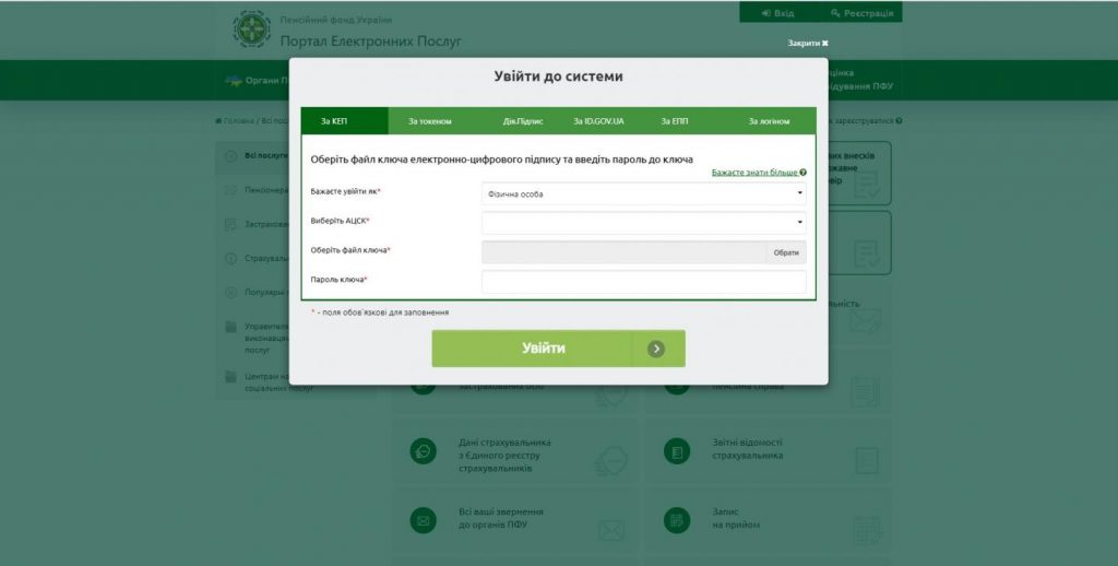 1. Зайдіть в особистий кабінет на вебпорталі електронних послуг ПФУ з допомогою КЕП.