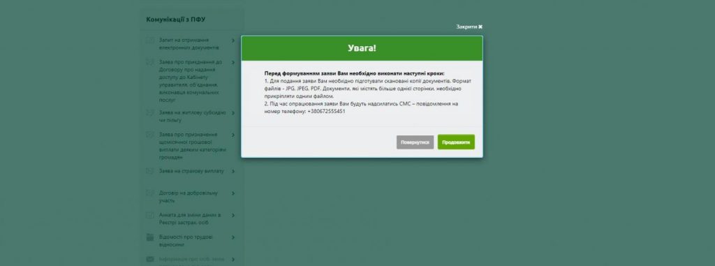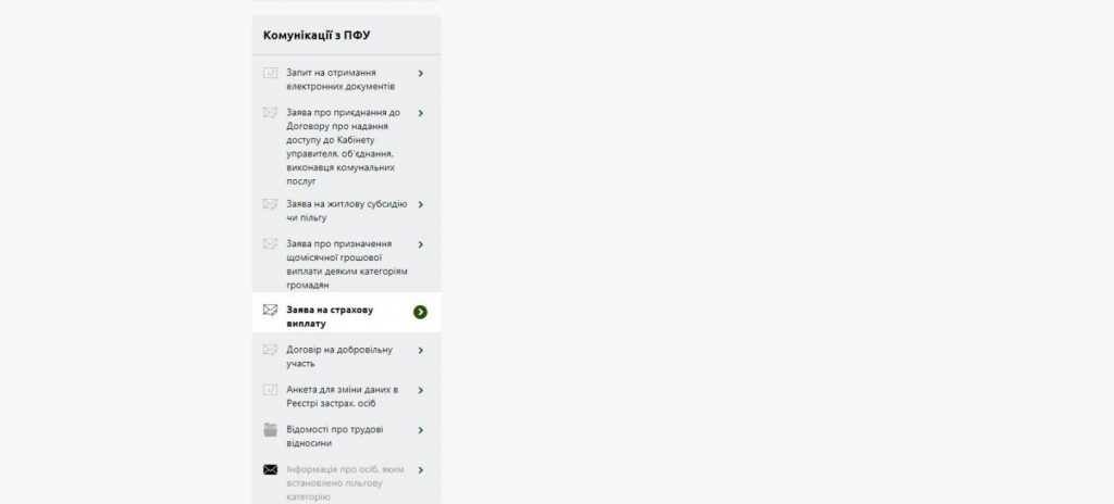 2. В особистому кабінеті на панелі зліва в розділі «Комунікації з ПФУ» оберіть опцію «Заява на страхову виплату».
