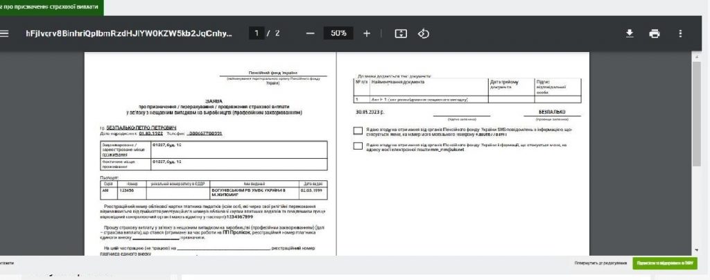 7. Перевірте дані сформованої заяви, підпишіть КЕП та надішліть до ПФУ.