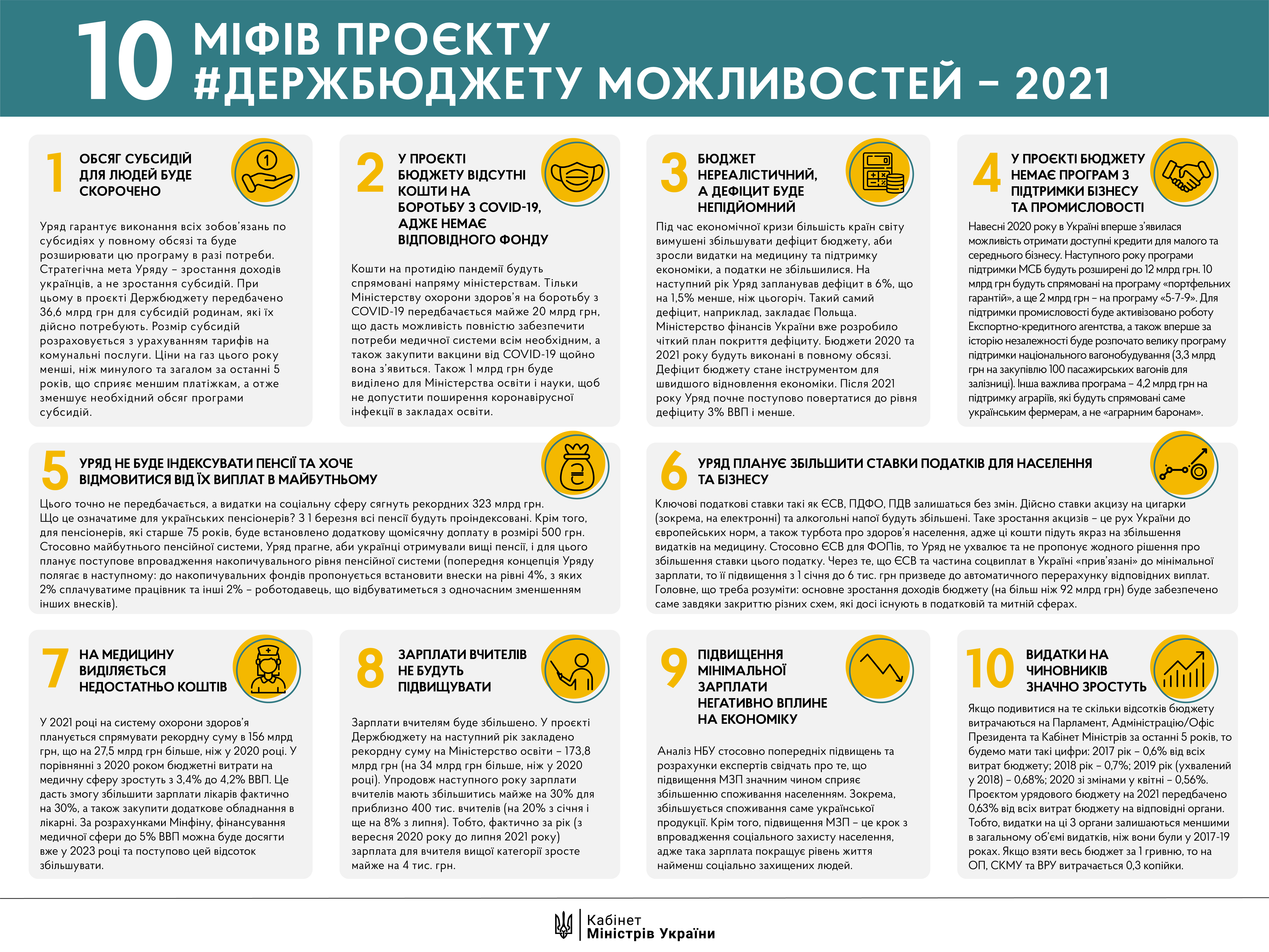 Наразі проєкт Держбюджету-2021 перебуває на розгляді у Верховній Раді. Навколо кошторису точиться багато розмов, проєкт обростає міфами. Урядовці вирішили розвінчати 10 найпопулярніших міфів про Державний бюджет на 2021 рік.