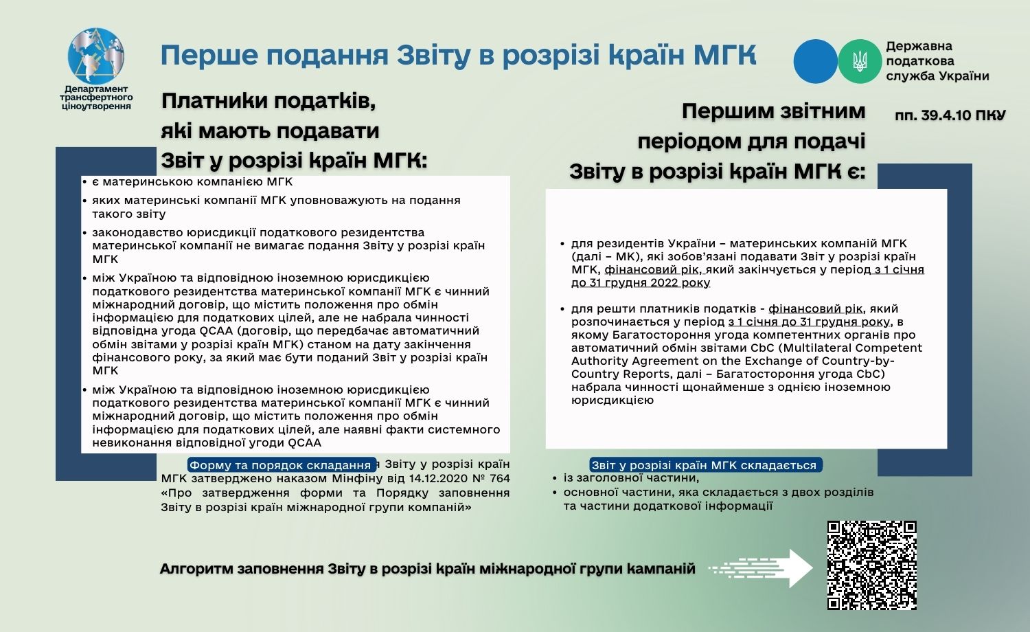 Платники податків — резиденти України, що належать до міжнародної групи компаній (далі — МГК), у випадках, що визначили підпунктом 39.4.10 Податкового кодексу України (ПК) зобов’язані подавати до ДПС в електронній формі звіт у розрізі країн міжнародної групи компаній (далі — Звіт МГК).