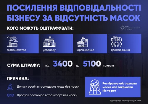 Народні депутати підтримали законопроєкт №3890, який має запровадити штрафи для власників бізнесу, установ та організацій за те, що їхні відвідувачі не носять захисні маски. Згідно із цим законопроєктом, штрафувати будуть за пропуск людей під час карантину в громадські будинки, споруди, громадський транспорт без вдягнутих респіраторів, захисних масок, що закривають ніс та рот.