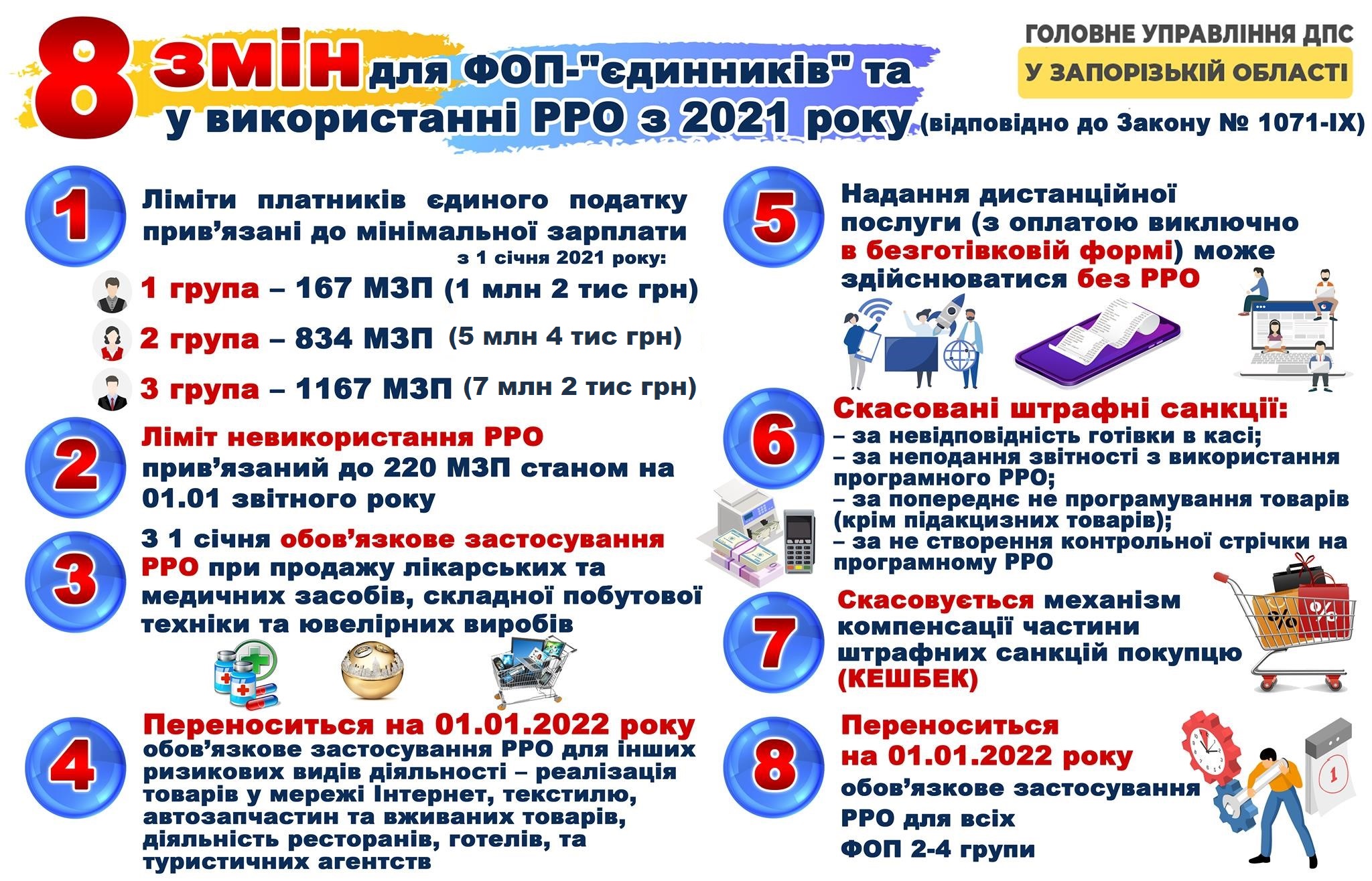 Податківці розробили інфографіку про 8 змін для ФОП-єдинників та у використанні РРО з 2021 року (згідно Закону № 1071-ІХ). Скачайте, роздрукуйте і уникніть помилок.