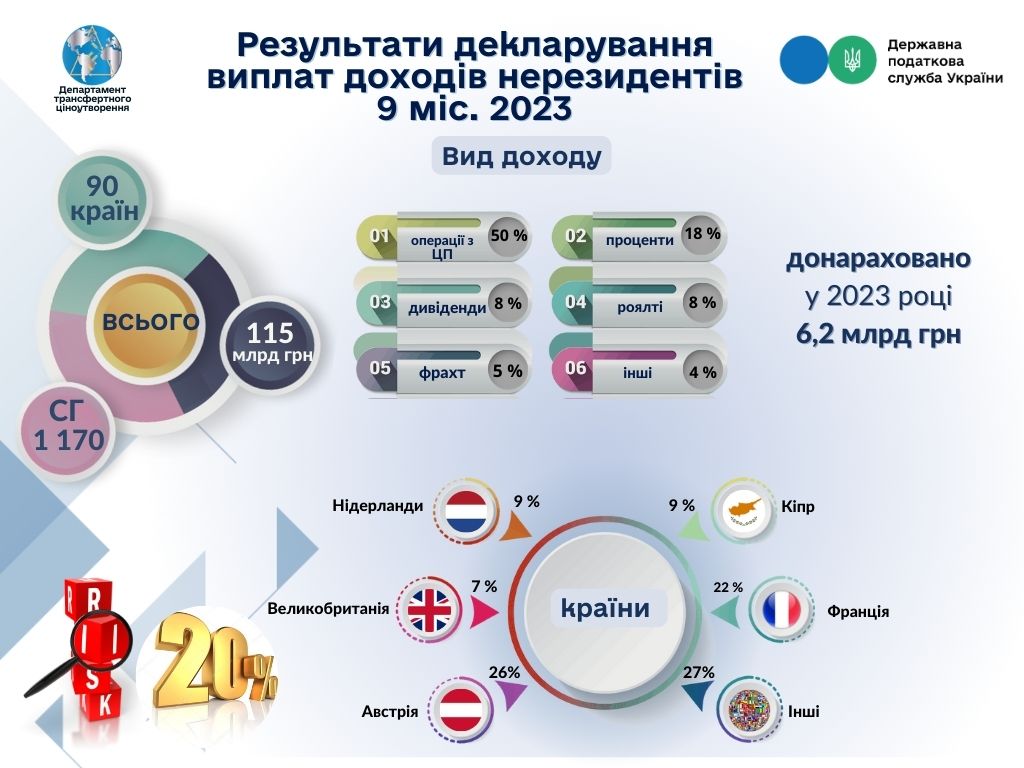 Сьогодні виплату доходів нерезидентів з джерелом походження з України частково використовують як підґрунтя для виведення коштів. Так, за підсумками 9 місяців 2023 року спрямували за кордон 115 млрд грн доходу, що на 19% менше аналогічного періоду 2022 року, з яких нараховали до сплати 1,7 млрд грн податку.