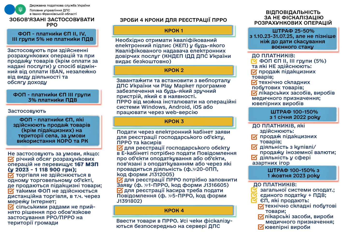 Про обов’язок застосування РРО/ПРРО ФОП-єдинниками, алгоритм реєстрації ПРРО та відповідальність за не фіскалізацію розрахункових операцій — у пам’ятці податківців