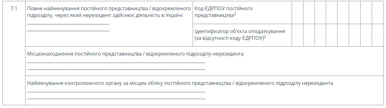 У зносці до рядка вказано, що у разі здійснення нерезидентом діяльності на території України через постійне представництво зазначають код за ЄДРПОУ такого постійного представництва. Якщо нерезидент здійснює діяльність через неакредитований відокремлений підрозділ, зазначають ідентифікатор об'єкта оподаткування згідно з повідомленням про такий об'єкт оподаткування, поданим до контролюючого органу відповідно до вимог пункту 63.3 Податкового кодексу України (далі — ПК).