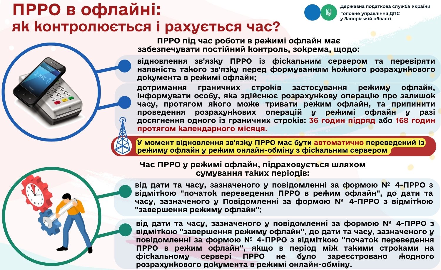 Отже, в ПРРО час перебування в режимі офлайн рахують відповідно від моменту переходу в режим офлайн до виходу з режиму офлайн (передача чеків/звітів сформованих в режимі офлайн на фіскальний сервер ДПС).