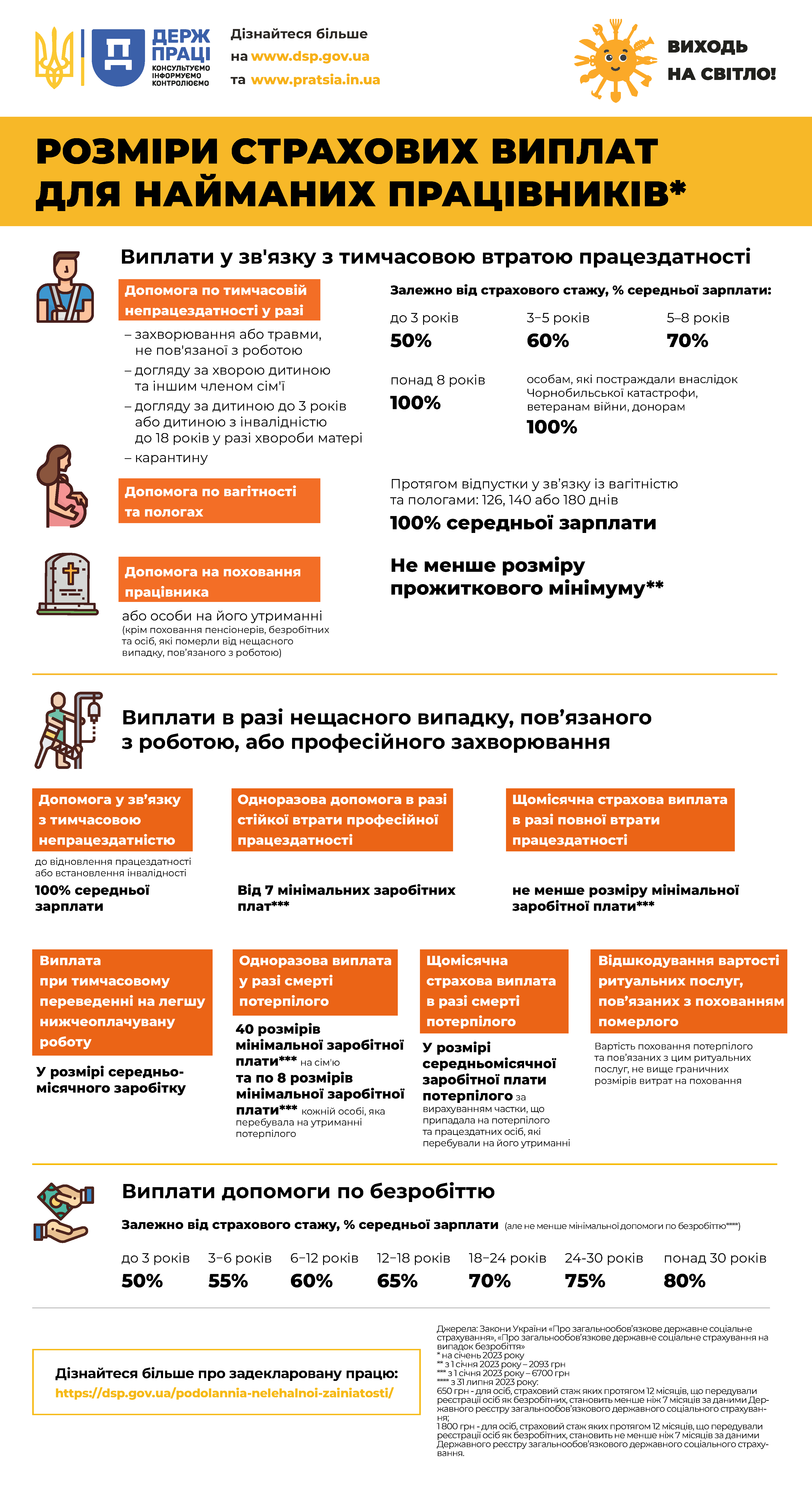 Податківці оприлюднили інфографіку про розміри страхових виплат для найманих працівників, а саме виплат у зв'язку з тимчасовою втратою працездатності та виплат у разі нещасного випадку, пов'язаного з роботою, або професійного захворювання