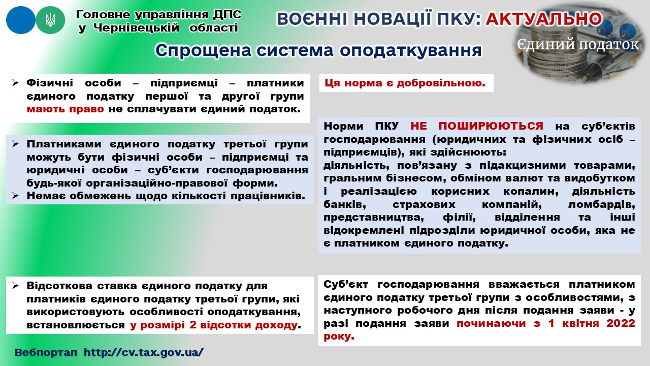 ГУ ДПС у Чернівецькій області підготувала пам’ятку щодо воєнних змін Податкового Кодексу України, які стосуються спрощеної системи оподаткування.