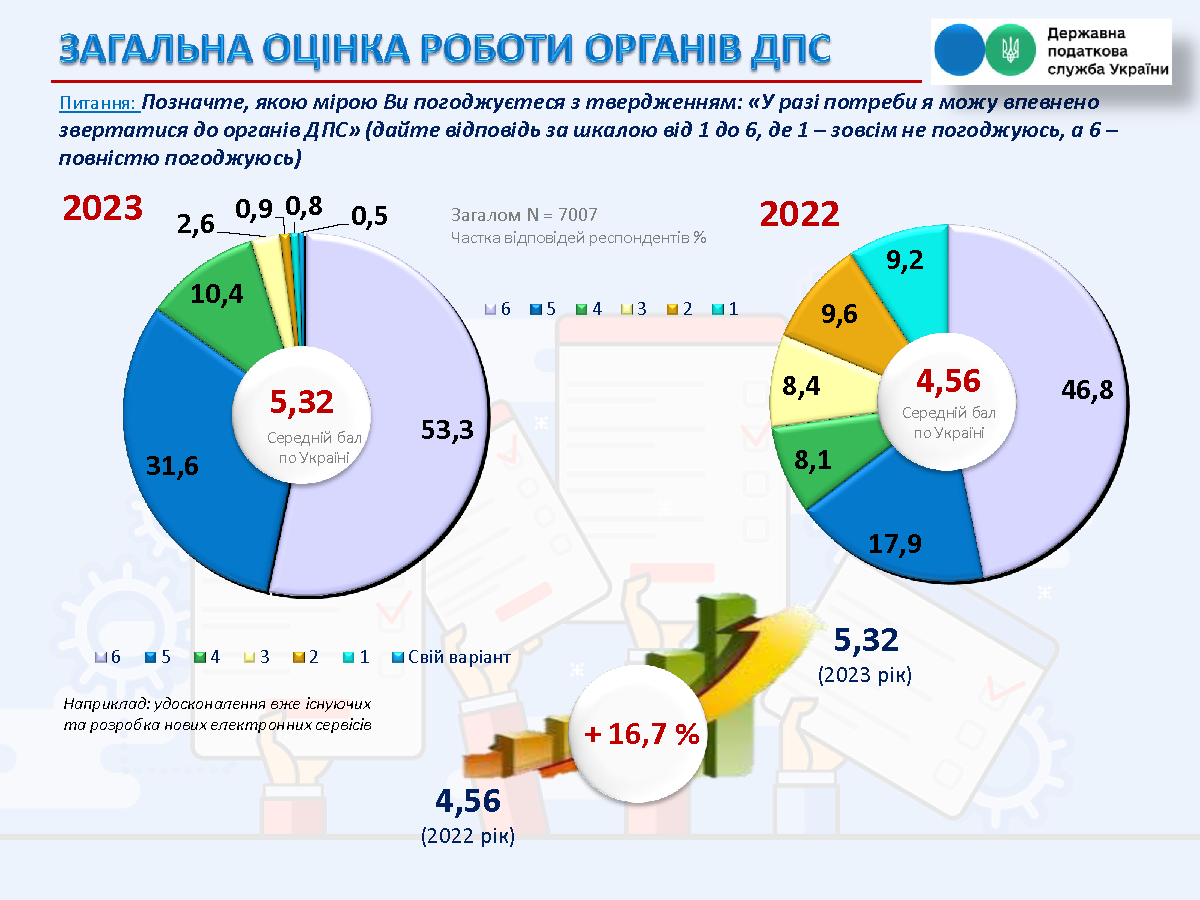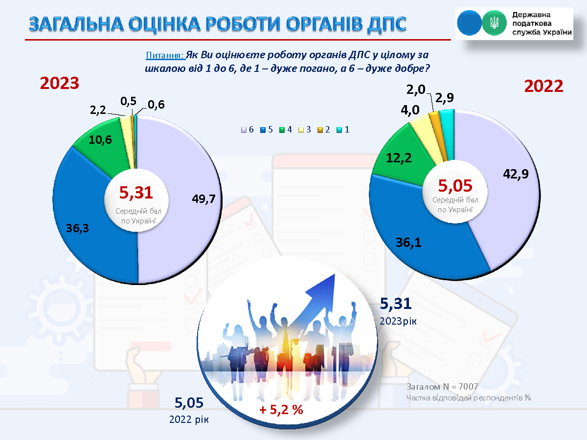 Загальна оцінка органів ДПС в цілому становить 5,31 бала із 6. У 2022 році цей показник складав 5,05 бала. Ріст склав 5,1%.