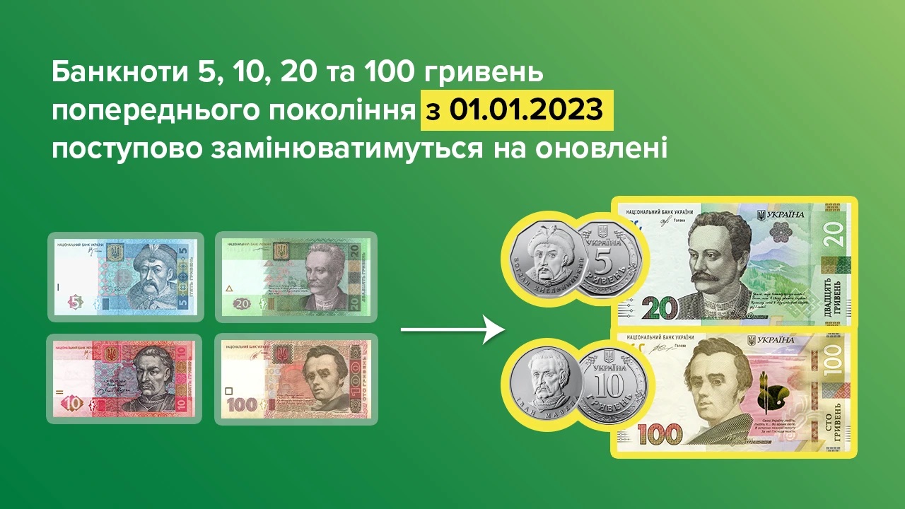 🎥 РОЗРАХУНКИ ПРИ ВИЇЗНІЙ ТОРГІВЛІ З 01.01.2023 НБУ поступово вилучатиме з обігу паперові банкноти номіналами 5, 10, 20 та 100 гривень зразків 2003 — 2007 років. Замість них в обіг надійдуть оновлені: