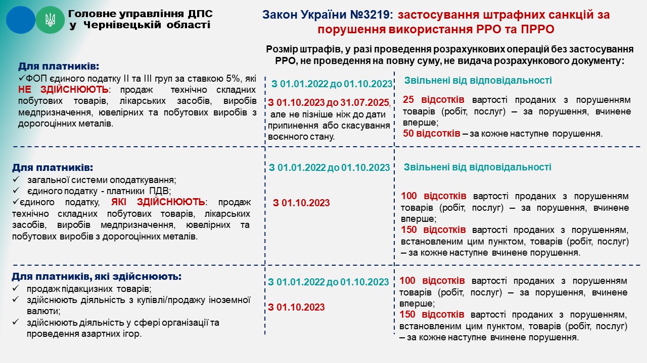 З 1 жовтня 2023 року органи контролю застосовують фінансові санкції у разі виявлення невикористання РРО/ПРРО з фіскальним режимом роботи. Для ФОП, які сплачують єдиний податок ІІ, ІІІ або IV групи, передбачені знижені штрафи за перше та кожне наступне порушення. Для платників єдиного податку, які є платниками ПДВ або реалізують товари з перелічених ризикових груп, штрафи за порушення у сфері РРО сплачуються в повному обсязі.