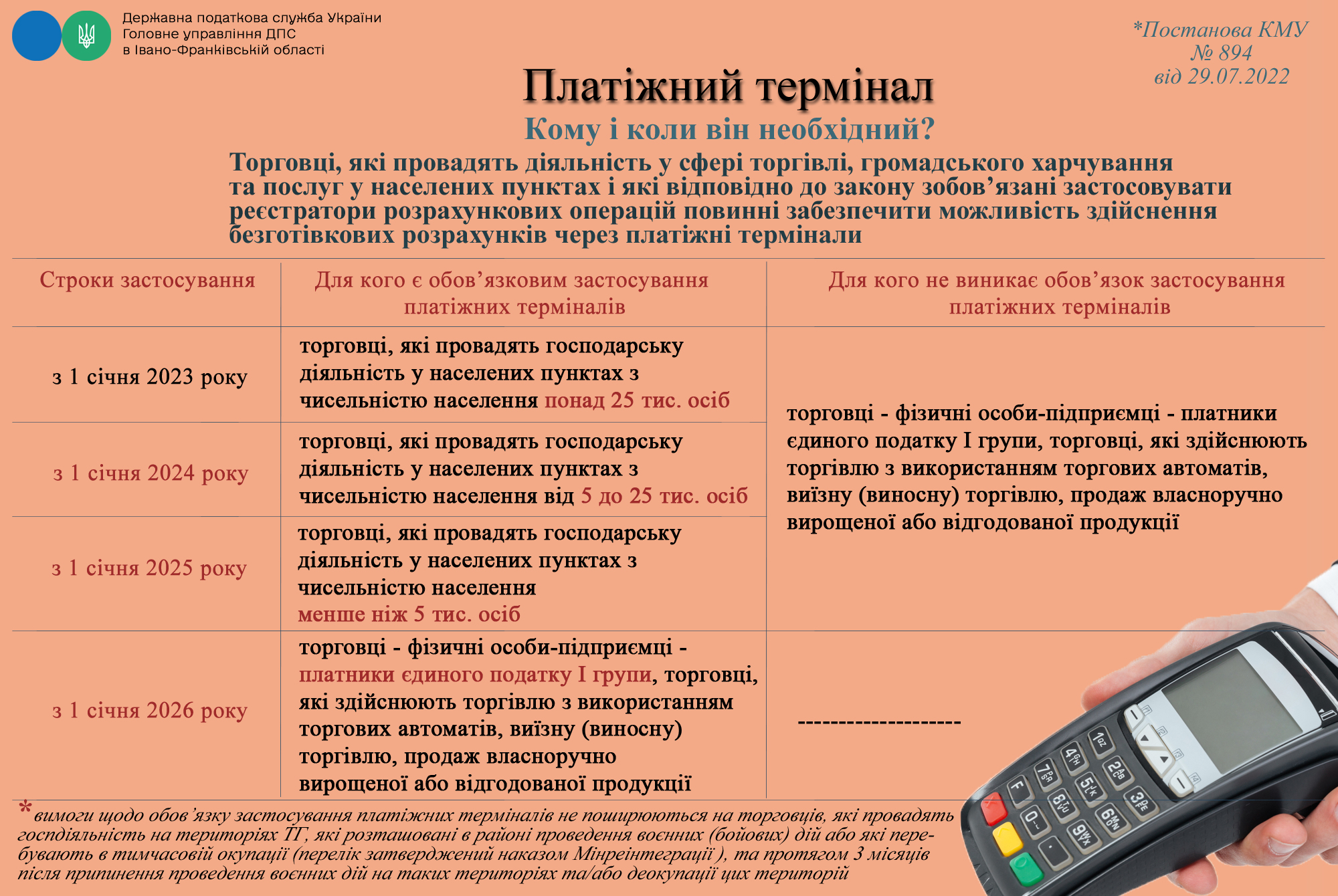 Примітка: запровадження з 1 січня 2025 року обов’язку відповідно до кількості населення не стосується торговців — ФОП-єдинників першої групи та торговців, які здійснюють торгівлю з використанням торгових автоматів, виїзну (виносну) торгівлю, продаж власноручно вирощеної або відгодованої продукції, які повинні будуть встановити POS-термінали з 1 січня 2026 року, незалежно від кількості населення.