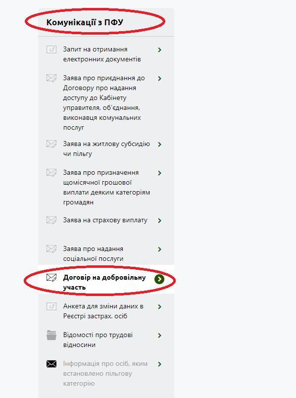 На панелі зліва в розділі «Комунікації з ПФУ» оберіть опцію «Договір на добровільну участь».