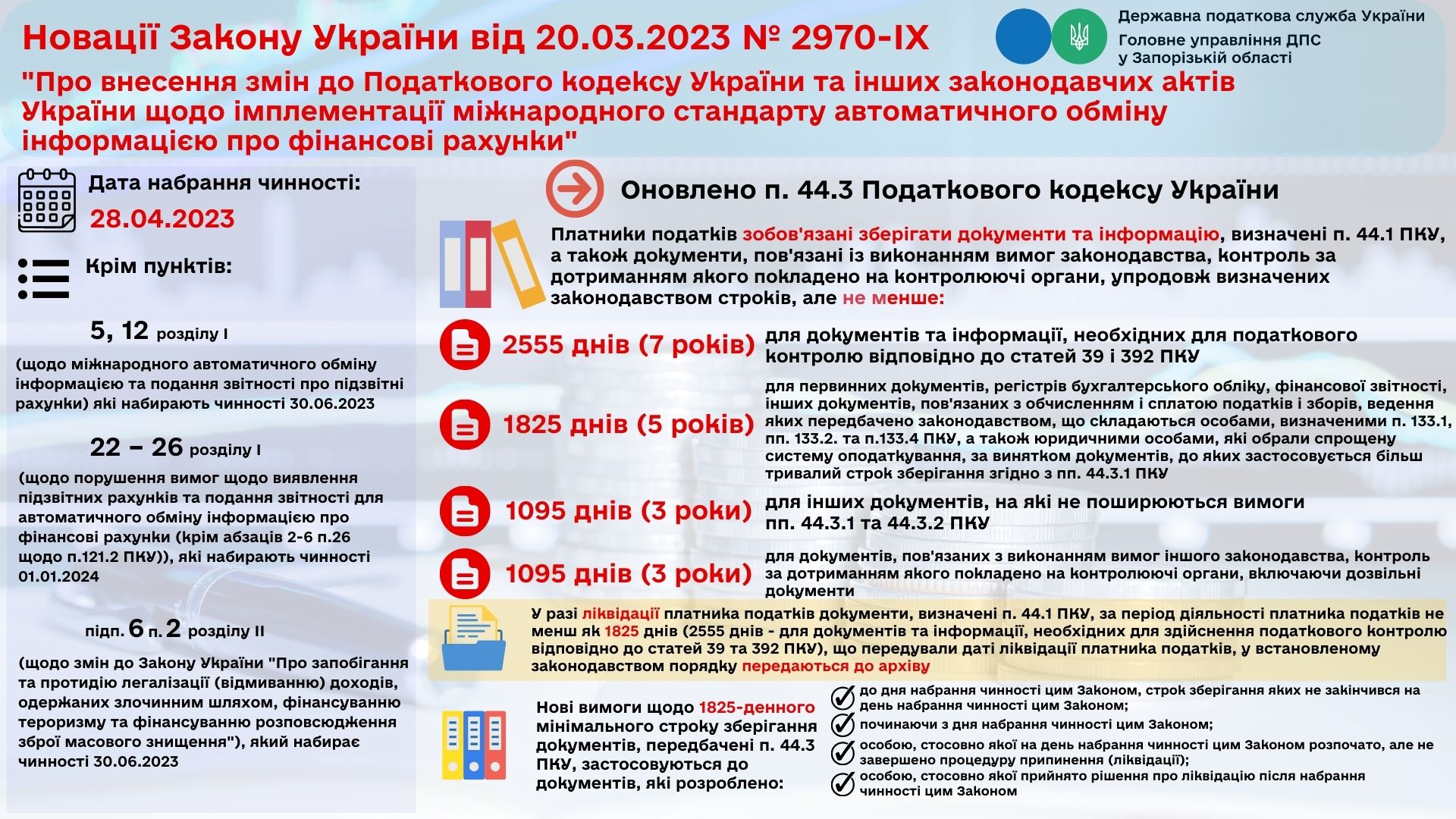 Закон України «Про внесення змін до Податкового кодексу України та інших законодавчих актів України щодо імплементації міжнародного стандарту автоматичного обміну інформацією про фінансові рахунки» від 20.03.2023 № 2970-ІХ (далі — Закон № 2970) прийняли з метою запровадження в нашій країні європейських стандартів податкової звітності та виявлення незадекларованих платниками активів.
