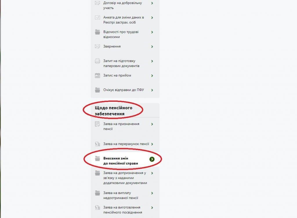Крок 2. В особистому кабінеті на панелі зліва в розділі «Щодо пенсійного забезпечення» оберіть опцію «Внесення змін до пенсійної справи».