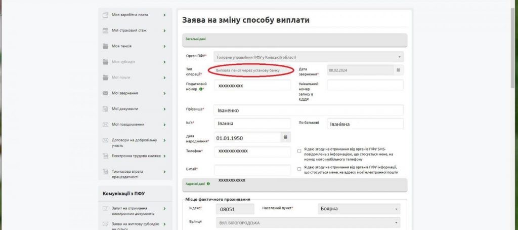 Крок 3. У вікні, що відкриється, із переліку заяв оберіть ту, яка вам потрібна («Заява про зміну способу виплати пенсії (у разі зміни способу виплати — з пошти на банк або навпаки)», «Заява на зміну виплатних реквізитів (у разі зміни банківських реквізитів або адреси проживання)», «Заява на виплату частини пенсії на непрацездатних членів сім’ї особи, яка перебуває на повному держутриманні», «Заява про переведення виплати з Укрпошти на Ощадбанк через платіжну систему MY TRANSFER», «Заява про зміну особистих даних пенсіонера (у разі зміни ПІБ та/або паспортних даних)». Натисніть на обране вікно.