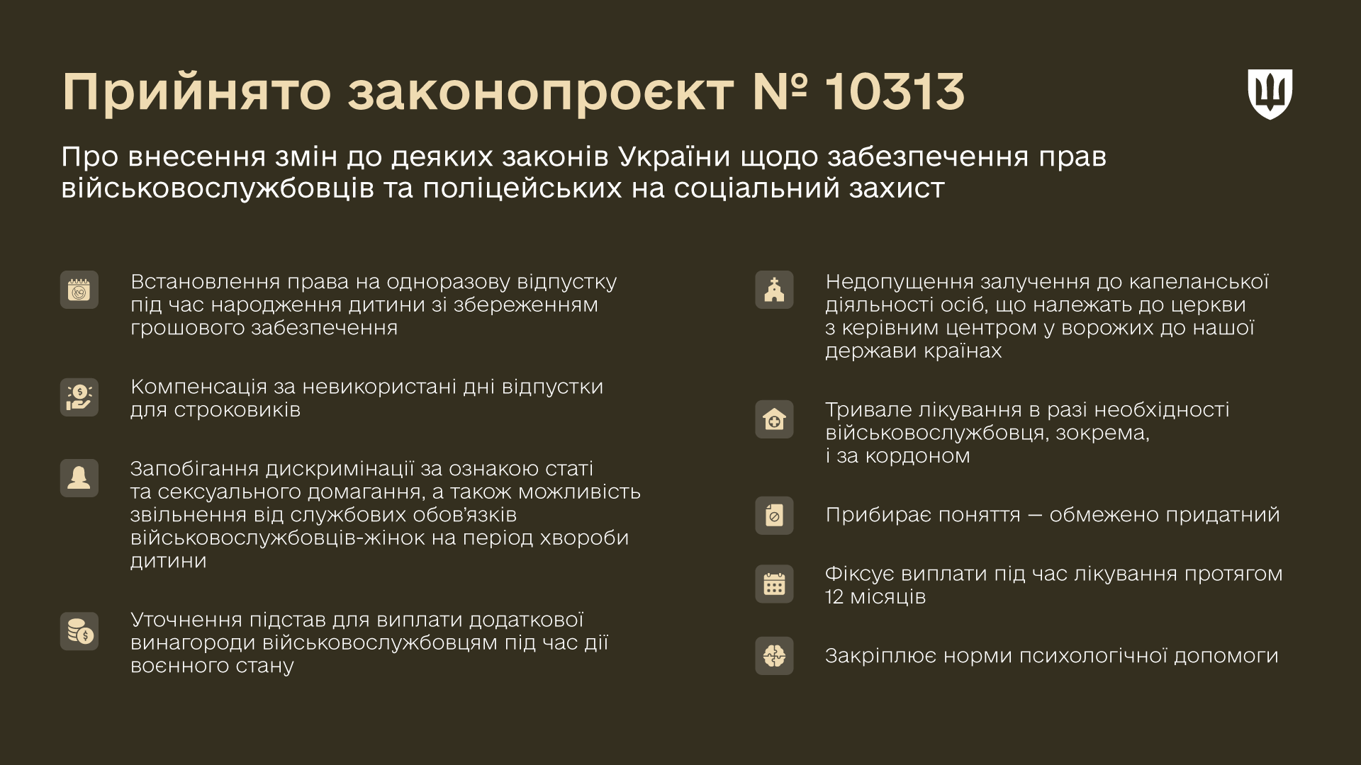 Документ, напрацьований робочою групою Комітету національної безпеки та оборони парламенту за активної участі Міноборони. Він передбачає низку норм, спрямованих на посилення соціального захисту військовослужбовців та забезпечення їхніх прав, зокрема: