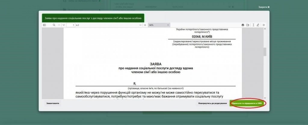 7. Перевірте дані сформованої заяви та натисніть кнопку «Підписати та відправити в ПФУ».