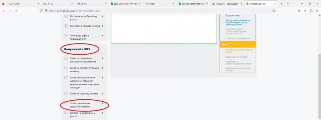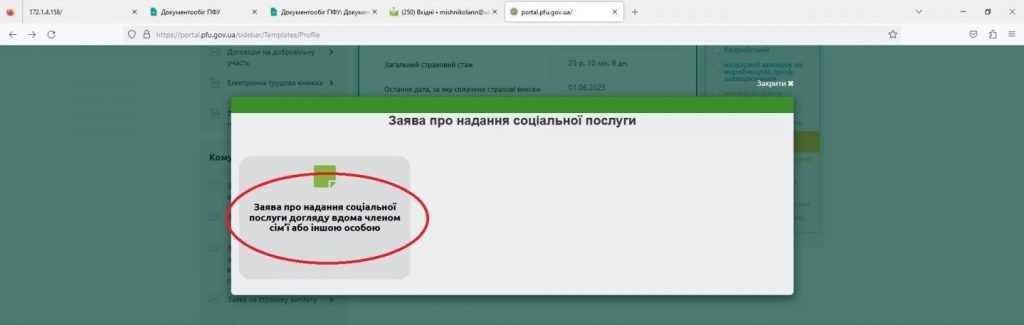 2. В особистому кабінеті на панелі зліва в розділі «Комунікації з ПФУ» оберіть опцію «Заява про надання соціальної послуги».