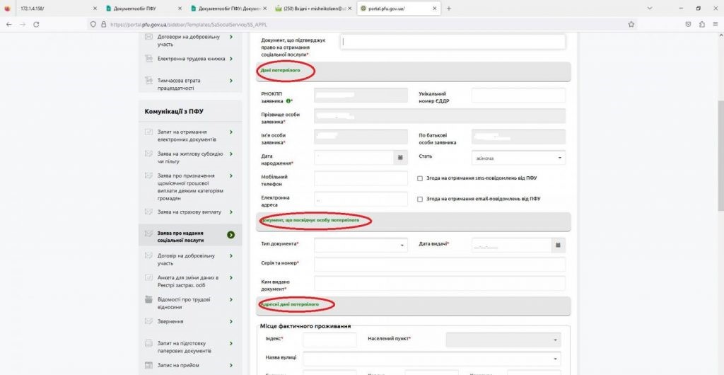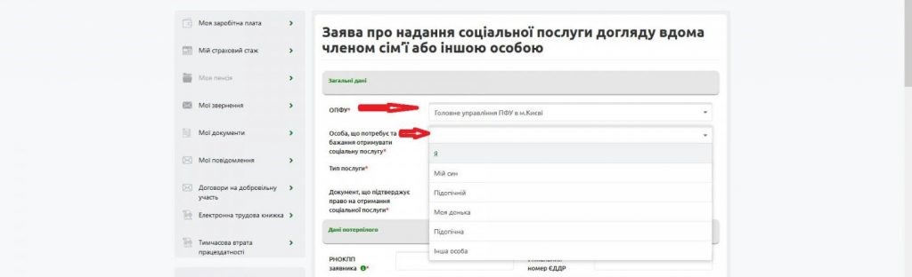 - оберіть головне управління ПФУ (ОПФУ), вкажіть особу, яка потребує та звернулася за отриманням соціальної послуги;