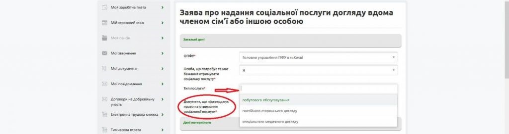 - натисніть на кнопку «Тип послуги», оберіть вид/види догляду з випадаючого списку та зазначте документ, що підтверджує право на отримання соціальної послуги;