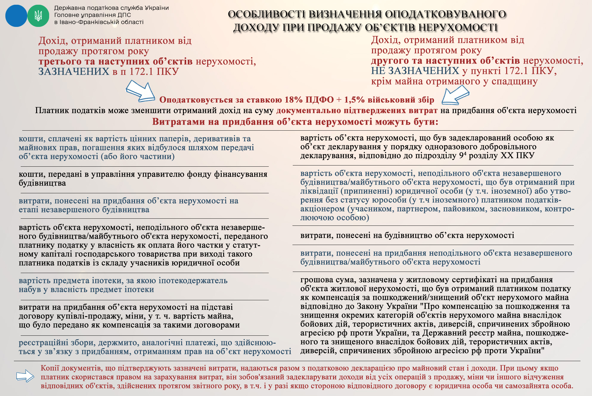 Порядок оподаткування операцій з продажу (обміну) об’єктів нерухомого майна, неподільного об’єкта незавершеного будівництва/майбутнього об’єкта нерухомості, подільного об’єкта незавершеного будівництва та відступлення прав за договором купівлі-продажу неподільного об’єкта незавершеного будівництва/майбутнього об’єкта нерухомості, щодо якого сплатили частково ціну та зареєстрували обтяження речових прав на користь покупця визначили, статтею 172 Податкового кодексу України.