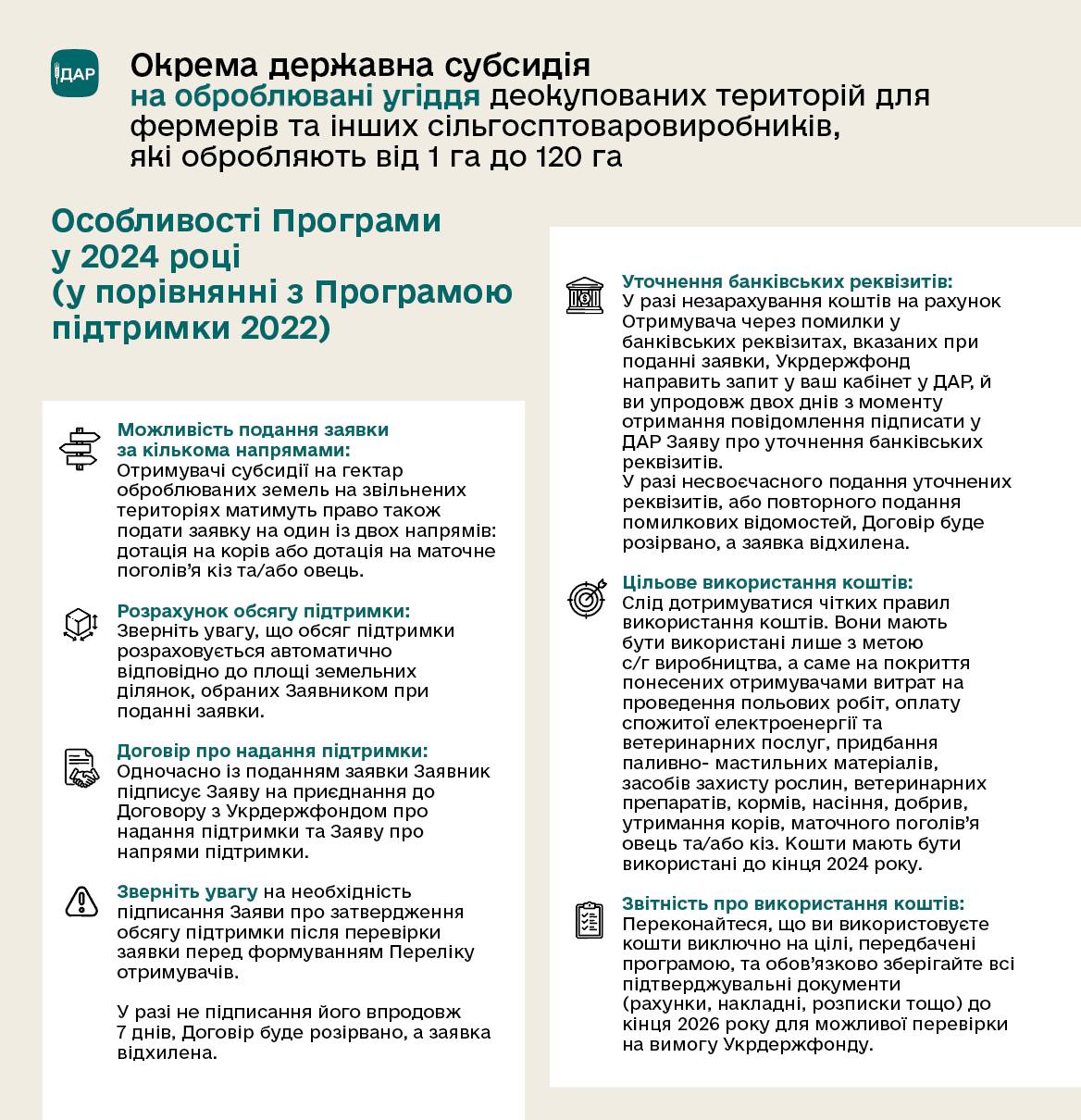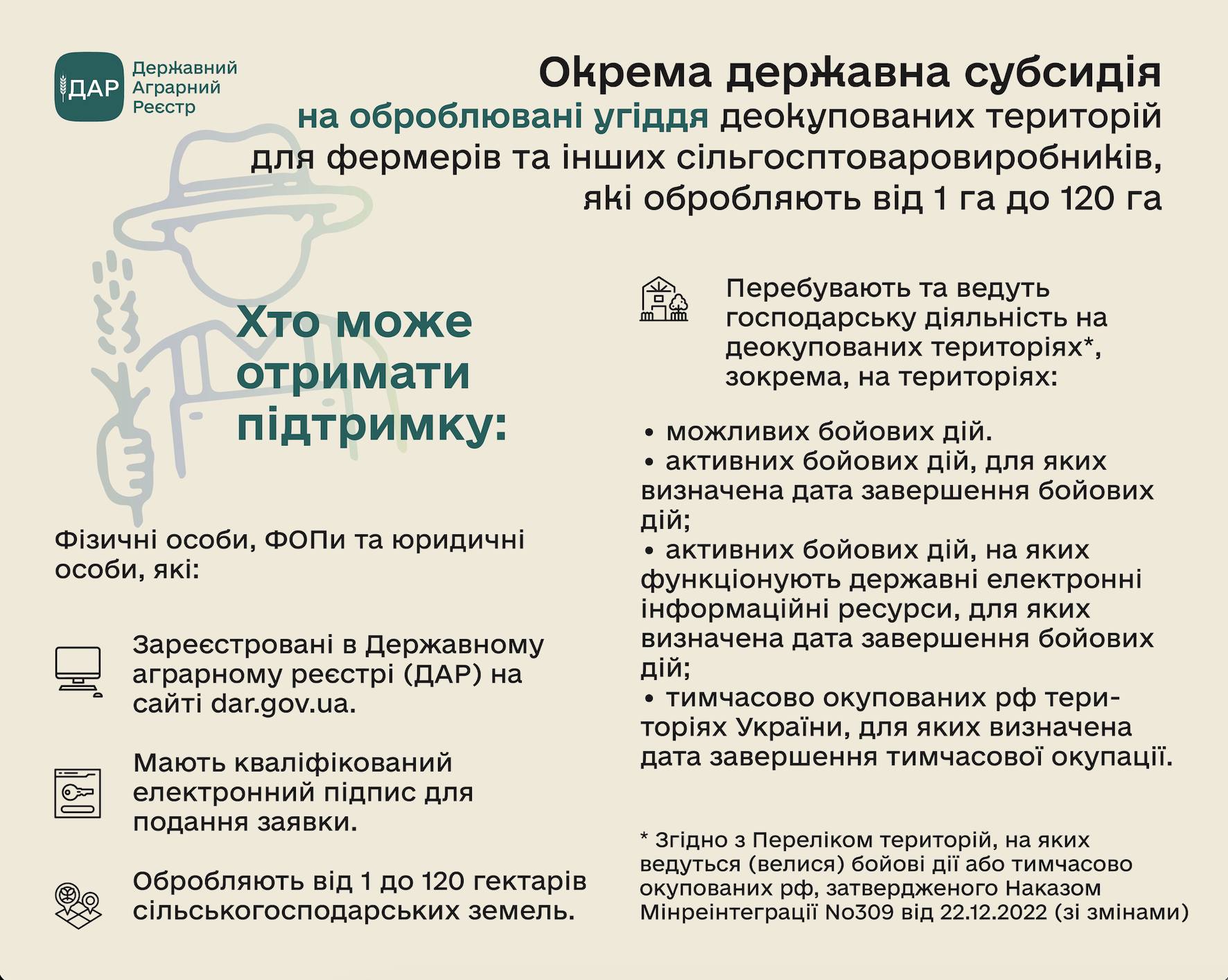 - ознайомтесь з умовами Порядку використання коштів, передбачених у державному бюджеті для надання підтримки фермерським господарствам та іншим виробникам сільськогосподарської продукції, затвердженого постановою КМУ від 16.08.2022 № 918;