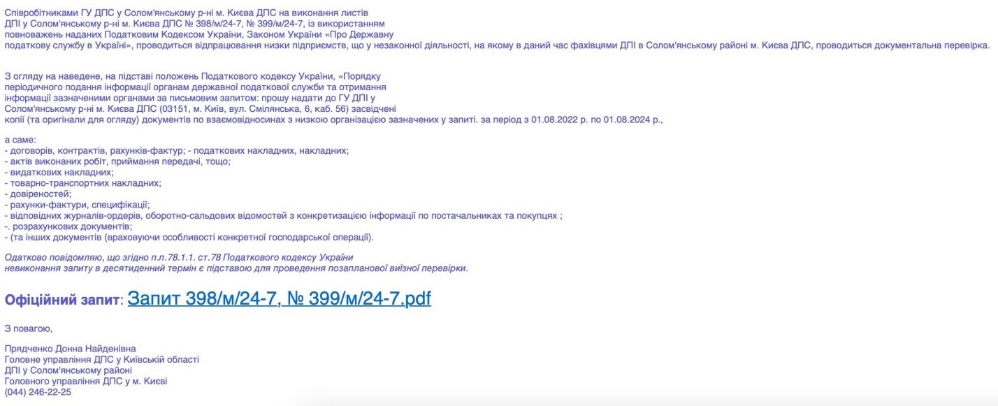 У листі йдеться про надання копій документів для проведення перевірки із вкладенням «Офіційний запит».