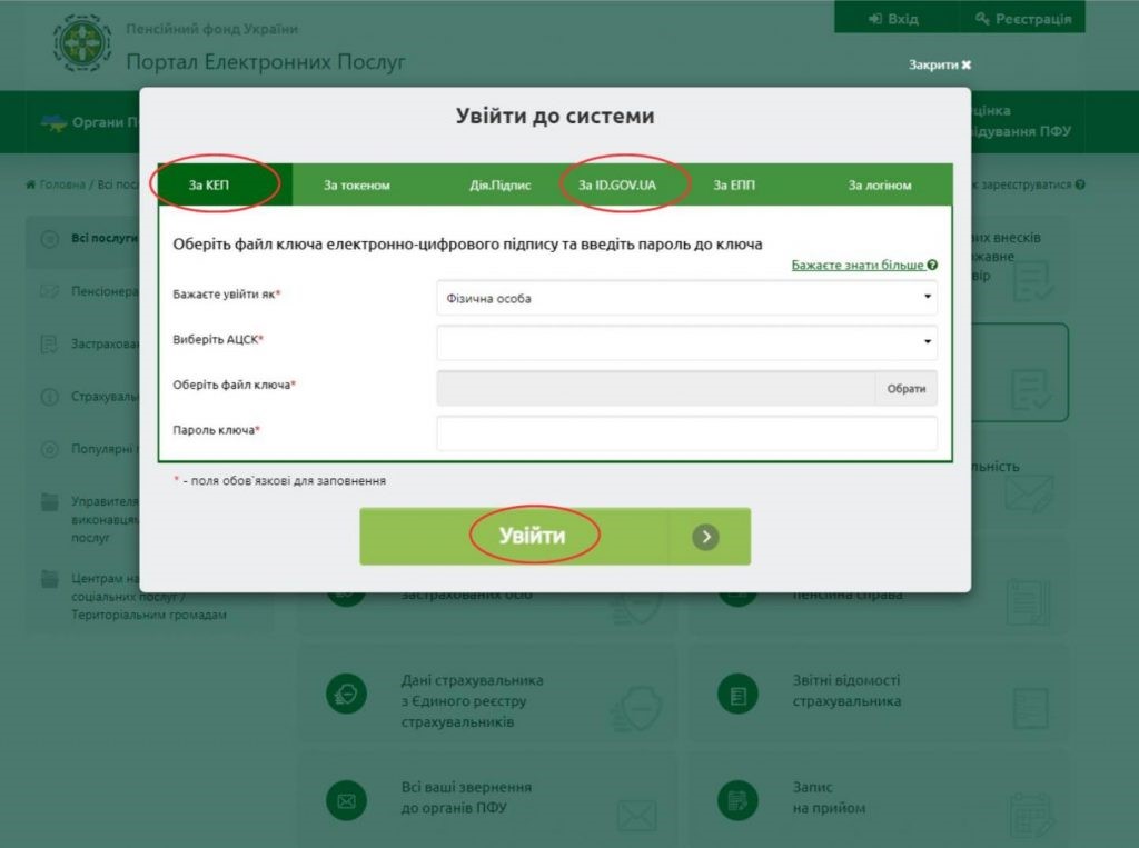 1. Авторизуйтеся в особистому кабінеті електронних послуг ПФУ за допомогою кваліфікованого електронного підпису (КЕП) або інтегрованої системи електронної ідентифікації (ID.GOV.UA) і натисніть кнопку «Увійти».