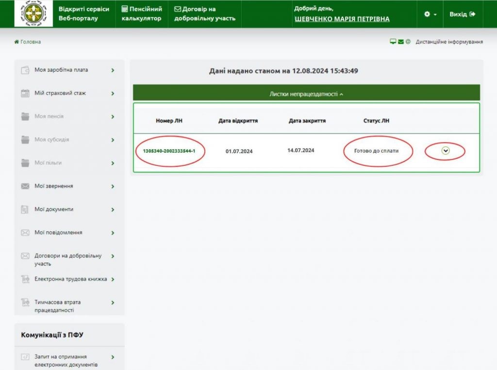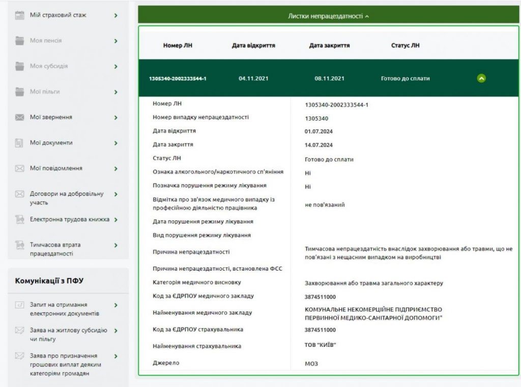 4. Перегляньте коротку інформацію про поточний листок непрацездатності. Розгорніть для детального ознайомлення та натисніть піктограму з галочкою.