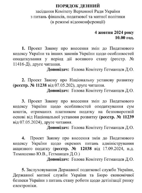 4 жовтня, в пʼятницю, в податковому Комітеті запланований розгляд до другого читання урядового законопроєкту від 30.08.2024 № 11416-д про рекордне підвищення податків