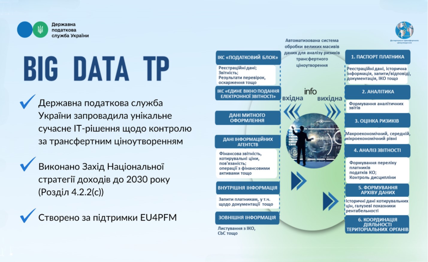 ДПС за підтримки EU4PFM створила унікальне ІТ-рішення: «Автоматизована система роботи з великими масивами даних для проведення аналізу ризиків з трансфертного ціноутворення» (Big Data Transfer Pricing) для вдосконалення податкового контролю за трансфертним ціноутворенням (ТЦ). Інноваційне та сучасне ІТ-рішення розробили задля: