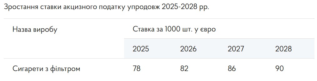 - поступове до 2028 року підвищення специфічних ставок акцизного податку з сигарет до досягнення мінімального рівня, встановленого Директивою Ради 2011/64/ЄС від 21.06.2011 щодо структури та ставок акцизного збору на тютюнові вироби (кодифікація), з одночасним еквівалентним підвищенням таких ставок на тютюн, промислові замінники тютюну та зменшенням їх розміру для тютюновмісних виробів для електричного нагрівання;